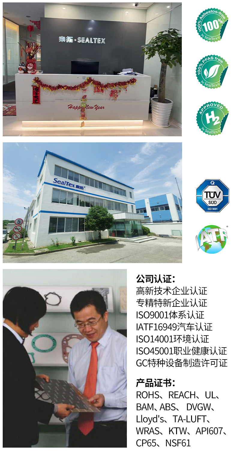 SealTex has been committed to the production and sales of 100% asbestos-free environmental sealing gaskets and high-temp thermal insulation products, participate in a number of National Standards establishment, engineering support to the customers such as FUJI test and FEA,. SealTex has passed ISO9001, IATF16949, ISO14001, ISO45001 and obtained local GC special equipment manufacturing licence. The production locates in Songjiang Industrial Park, Shanghai, with various processing equipment to achieve vertical production system from raw material compounding to precision die-cutting.