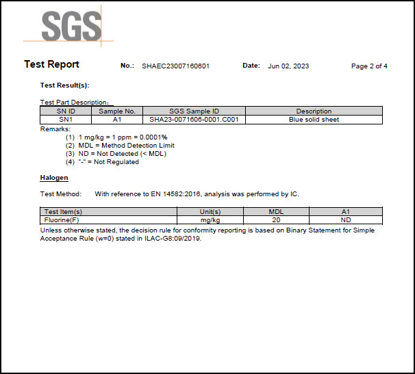 為滿足客戶需求,近日SealTex索 ST-2058無石棉板通過了SGS進(jìn)行的鹵素(氟)檢測,檢測標(biāo)準(zhǔn)EN 14582-2016,報(bào)告顯示未測出氟,報(bào)告部分截圖如下: