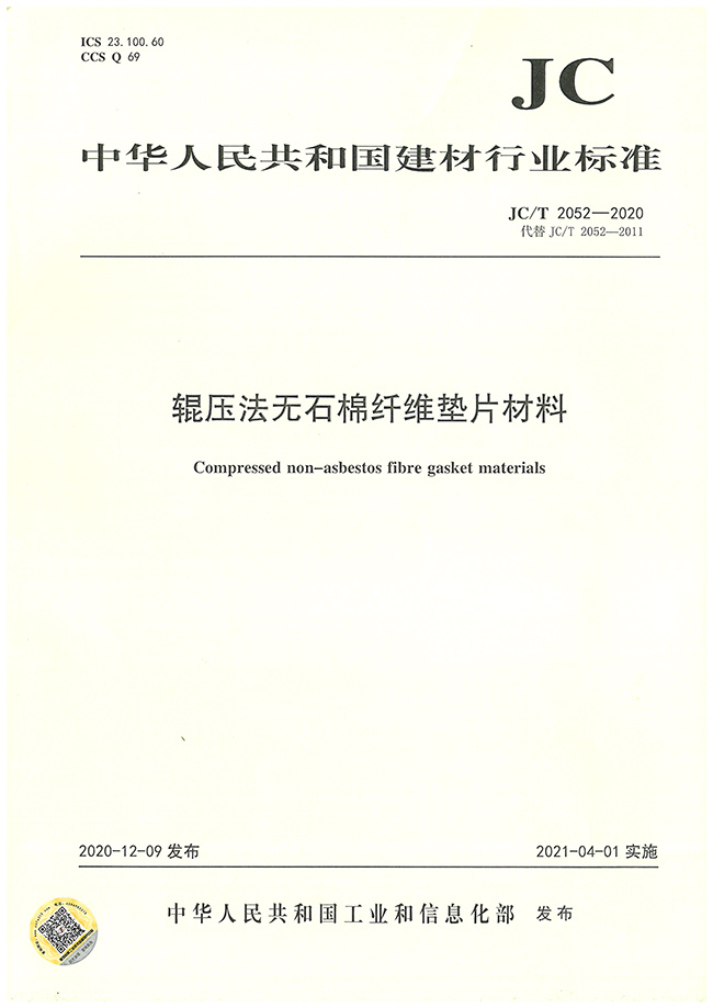 是JC/T 2052-2020《輥壓法無石棉纖維墊片材料》標準的第三起草單位。
