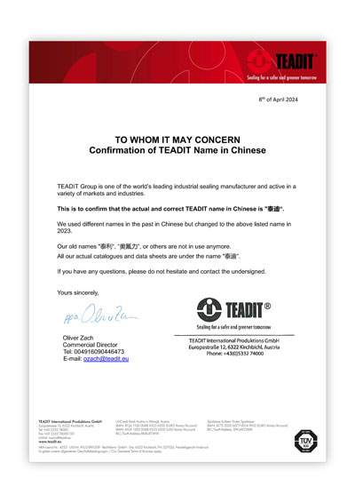 TEADIT于2023年起啟用新中文名“泰迪” 世界領先的工業(yè)密封制造商品牌TEADIT集團宣布:TEADIT于2023年起啟用新的中文名“泰迪”。 過去使用的中文名稱“泰利”、“奧氟力”或其他名稱將不再使用,所有TEADIT產品的中文目錄和數(shù)據(jù)表都將以“TEADIT泰迪”為名。 上一個 返回列表 下一個